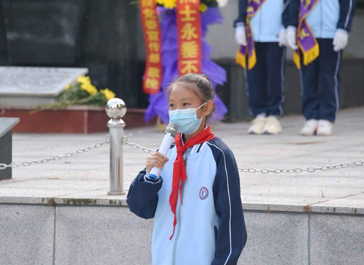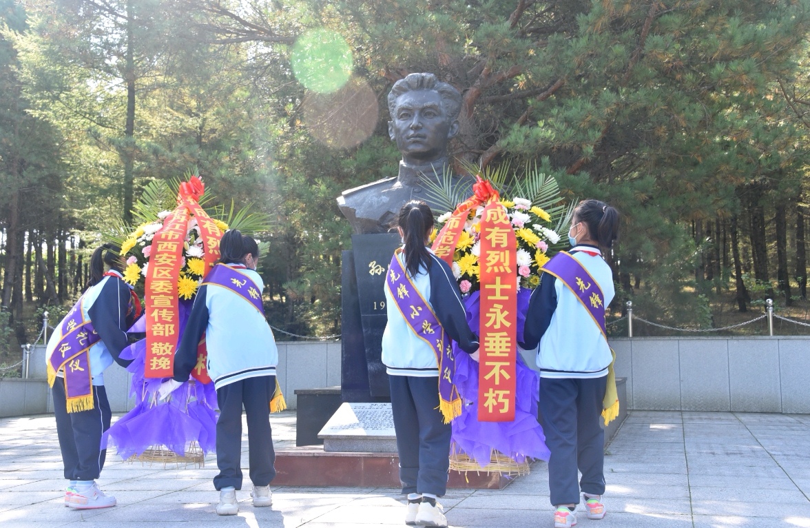 随着防空警报拉响,全体人员肃立默哀。随后,四名少先队员向孙成有烈士敬献了花篮。