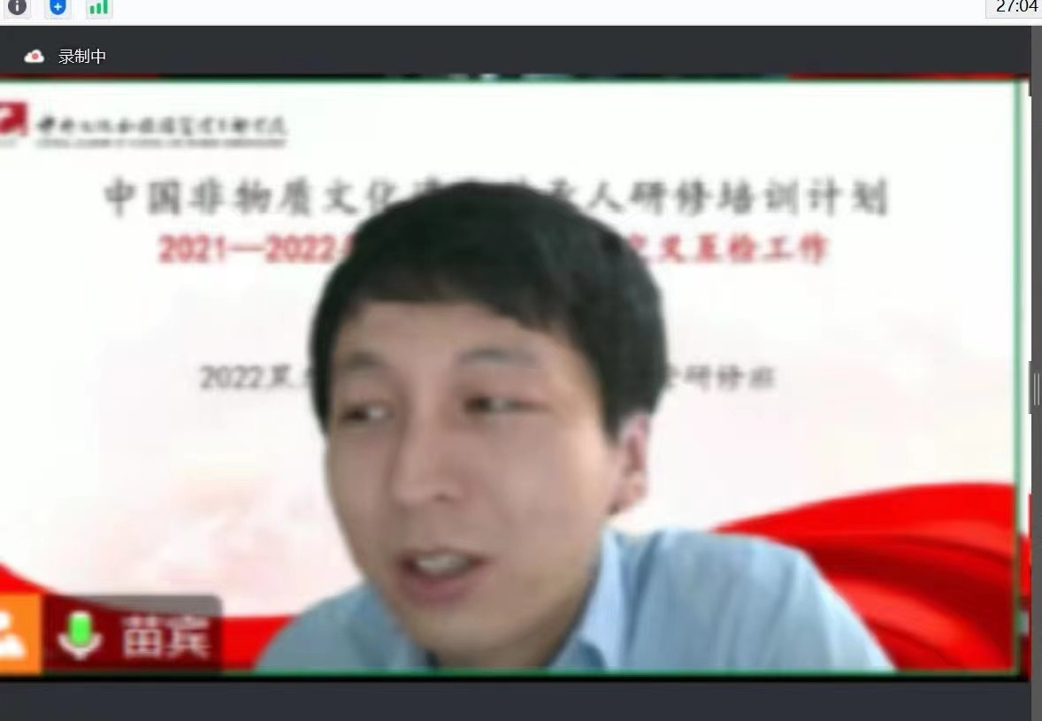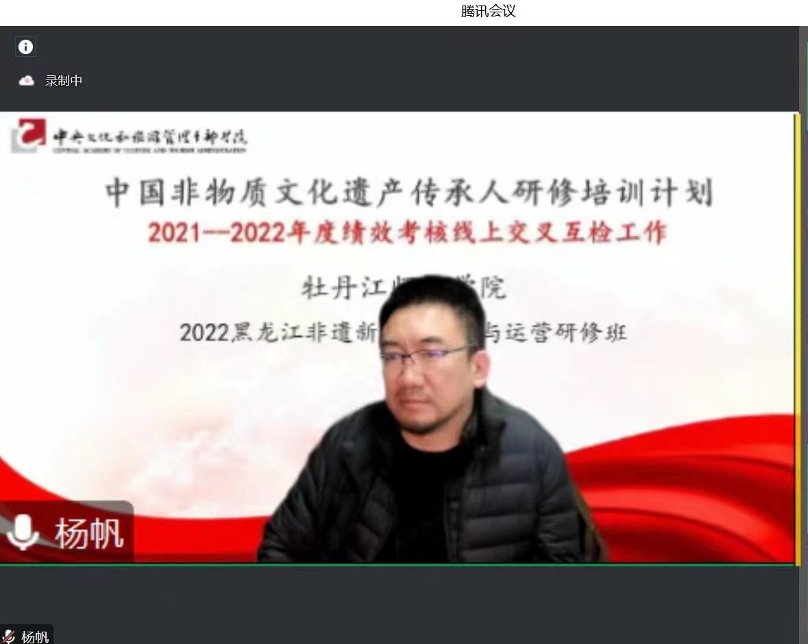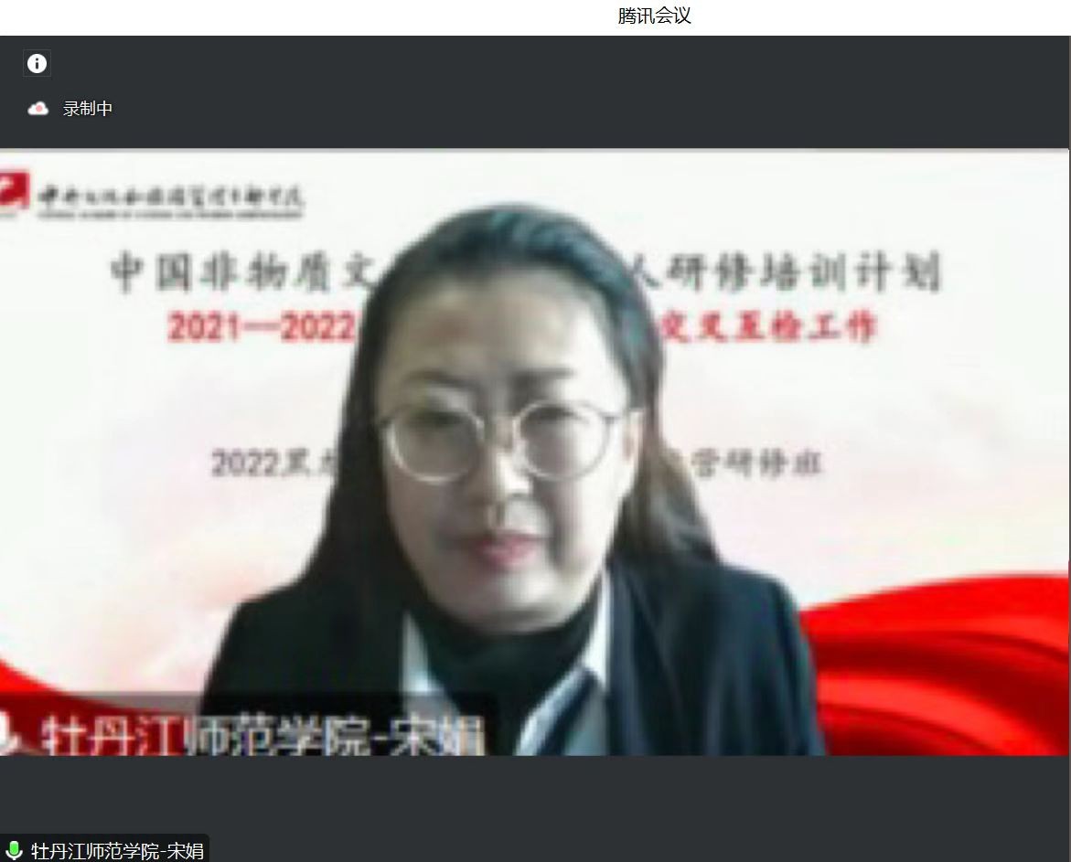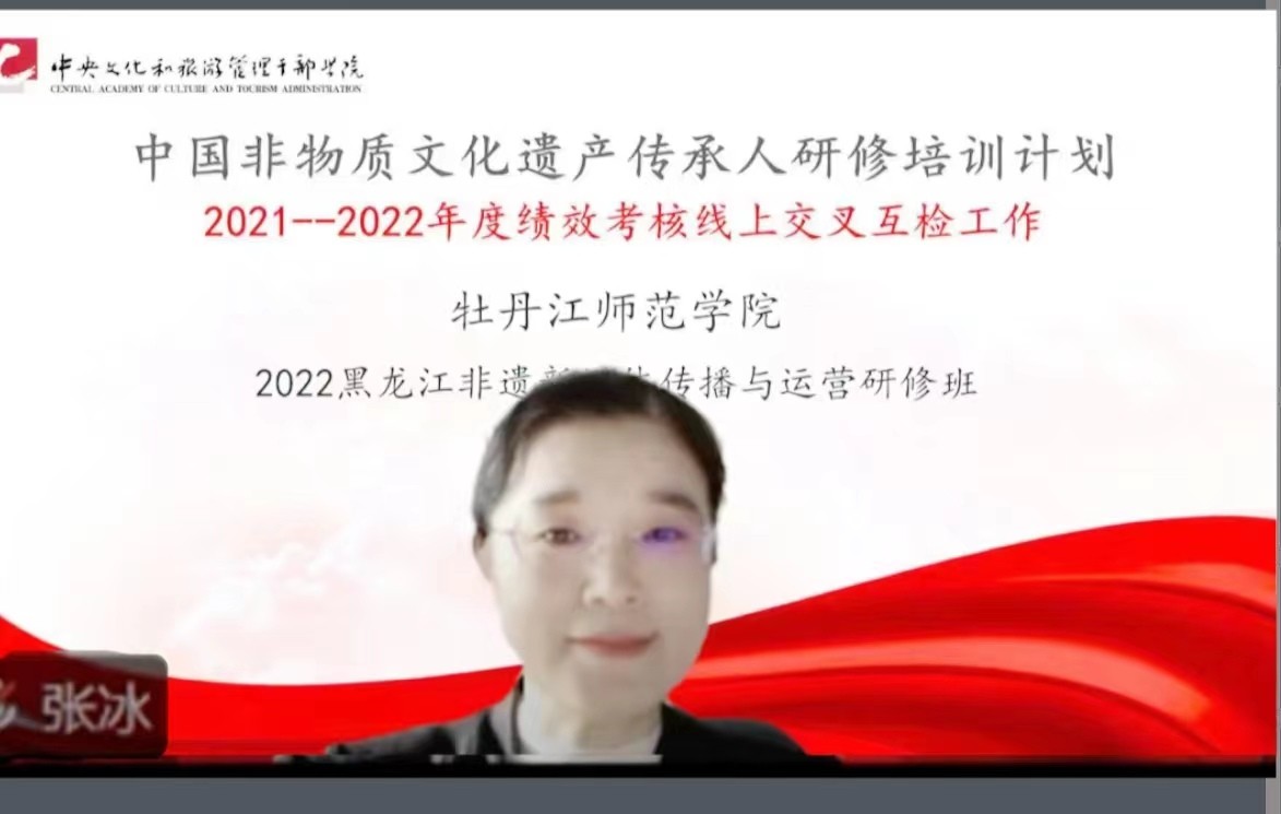 会上,宋娟教授向与会专家介绍了我校中国非物质文化遗产传承人研修培训计划项目开展情况,从教学组织、教学管理、保障机制、教学成果、反馈评价五个方面详细汇报了2022年黑龙江非遗新媒体传播与运营项目的实施情况,并同与会专家、全体参会人员一起观看了该项目专题片《云上守艺》。