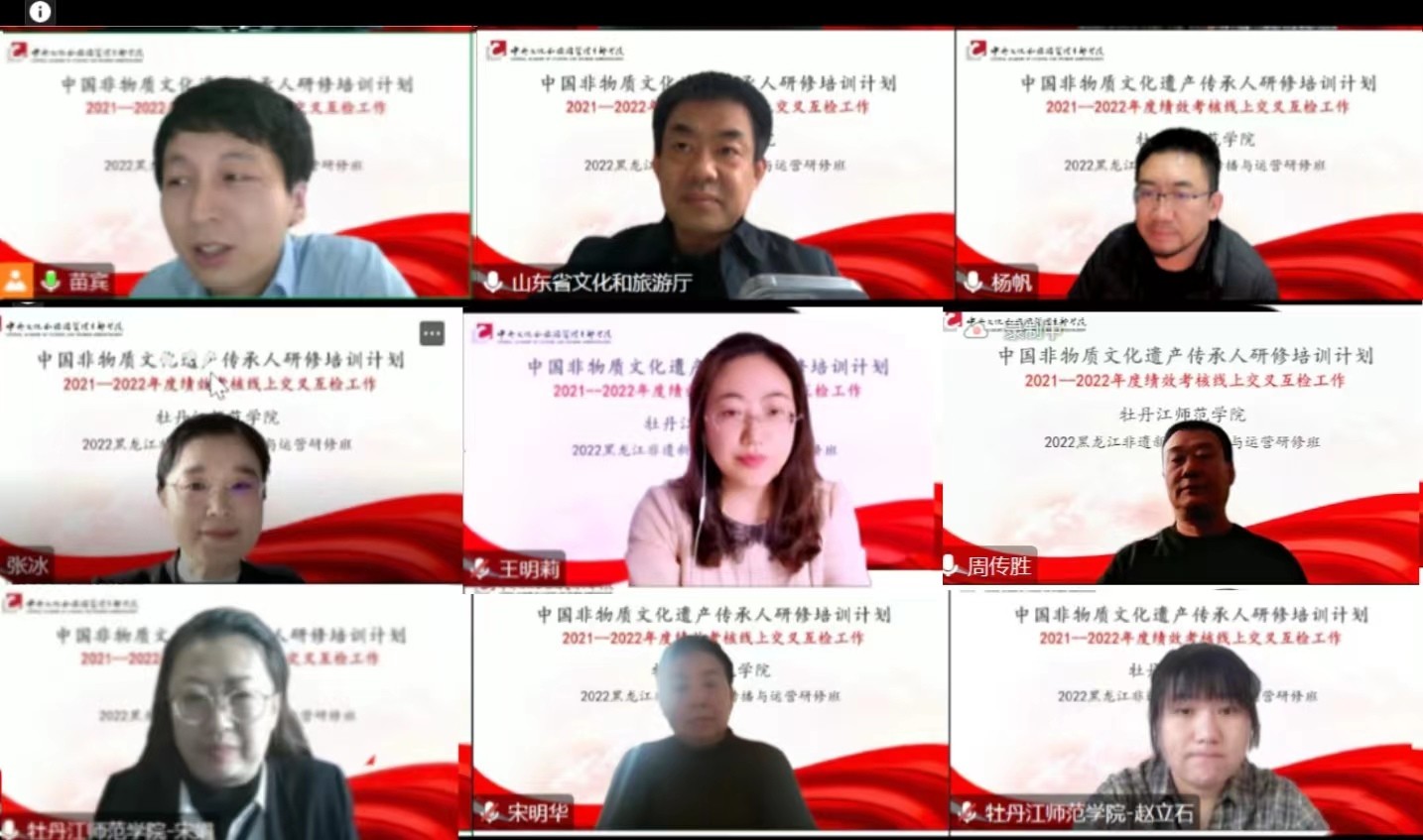 2月2日上午,我校中国非物质文化遗产传承人研修培训绩效考核座谈会在线举行。山东省文化和旅游厅非遗处处长刘鹏鑫,清华大学美术学院陶瓷艺术设计系党支部书记、副系主任、副教授杨帆;我校副院长张冰,省乡村教师教育发展学院(继续教育学院)直属党支部书记王明莉、院长周传胜,项目负责人、首席专家、文学院教授宋娟,项目宣传策划、文学院教授宋明华,项目班主任、美术与设计学院教师赵立石等项目相关工作人员参加了会议。会议由中央文化和旅游管理干部学院教务处副处长苗宾主持。