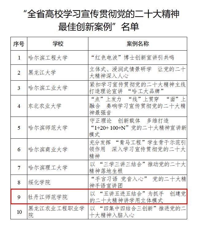 近日,黑龙江省教育工委公布了学习宣传贯彻党的二十大精神创新案例评选结果,我校报送的案例《以“五讲五进五结合”为抓手 创建党的二十大精神讲学用立体模式》获评“全省高校学习宣传贯彻党的二十大精神最佳创新案例”,《以中华诵·经典诵读为模式创新党的二十大学习方法手段》获评“全省高校学习宣传贯彻党的二十大精神优秀创新案例”。