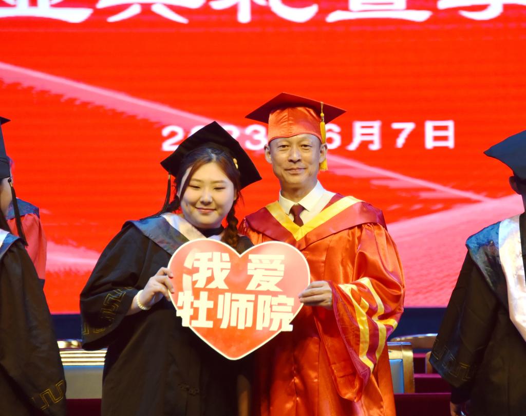 李春江院长深情回顾了毕业生们的成长与蜕变、学校的发展与成绩。他分享人生经验、寄予临别嘱托,叮嘱同学们健康是幸福之本,再忙也别忘了健身;学习是进步之源,再累也别忘了读书;感恩是美德之花,再苦也别忘了反哺。李春江院长饱含深情地讲道:“走得再远,都不能忘记牡师的小院;飞的再高,都不要忘记翱翔的起点。母校永远是你们最忠实的守望者,守望你们的未来,期待你们的归来!”
