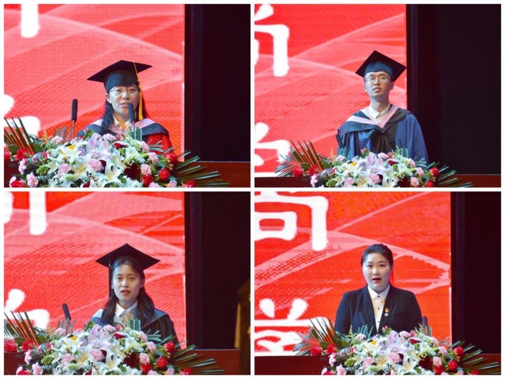 考取吉林大学物理化学专业硕士研究生的化学化工学院化学工程与工艺专业学生武琳代表2023届全体本科毕业生发言。她对母校的培养表示感谢,并表示要不断努力超越,以优异成绩守护身为师院人的荣光。考取陕西师范大学博士研究生的文学院中国古典文献学专业学生路鹏代表2023届全体研究生毕业生发言。他深情回顾三年求学时光,对母校和全体教师的辛勤培育致以崇高的敬意,祝愿母校永铸辉煌,再谱华章。校学生会主席团成员、计算机与信息技术学院计算机科学与技术专业2020级学生金禹彤代表全体在校向即将踏上人生新征程的毕业生们表示由衷的祝贺,并祝愿学长学姐们一帆风顺、前程似锦,在未来的征途中追寻更加辉煌的人生篇章。全国优秀教师、龙江学者青年学者、黑龙江省教学名师、八一农垦大学人文社会科学学院院长,中文系1998届毕业生田恩铭教授代表全体校友发言。他深情表达了毕业25年来对母校的无限感激和深深眷恋之情,希望毕业生从梦想者成为奋斗者、从孤勇者成为领军者、从博学者成为实践者,让母校放心、亲人开心、未来舒心,并祝愿母校为国育才的路越来越宽广,祝愿老师身体健康、万事如意,祝愿学弟学妹一切顺心、前程似锦。全国金课负责人、黑龙江省教学名师、博士、研究生学院院长孟令霞教授代表全体教师发言。她对2023届毕业生顺利完成学业表示诚挚的祝福和热烈的祝贺,并希望毕业生做胸怀理想、志存高远的人,做正直善良、平凡而不平庸的人,做脚踏实地、知行合一的人。