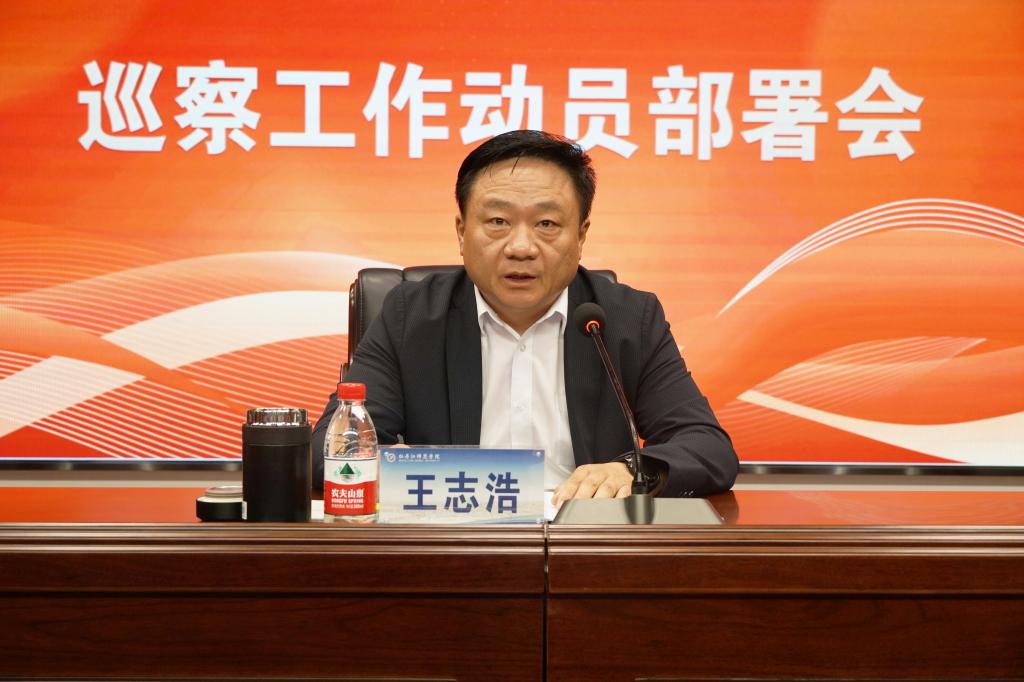 党委书记王志浩在会上讲话。王志浩书记指出,要提高站位,深刻认识巡察工作的重要意义。做好新时代巡察工作是做到“两个维护”的重要保障,开展校内巡察工作是深化党内监督的重要举措,是纵深推进全面从严治党的重要利器。
