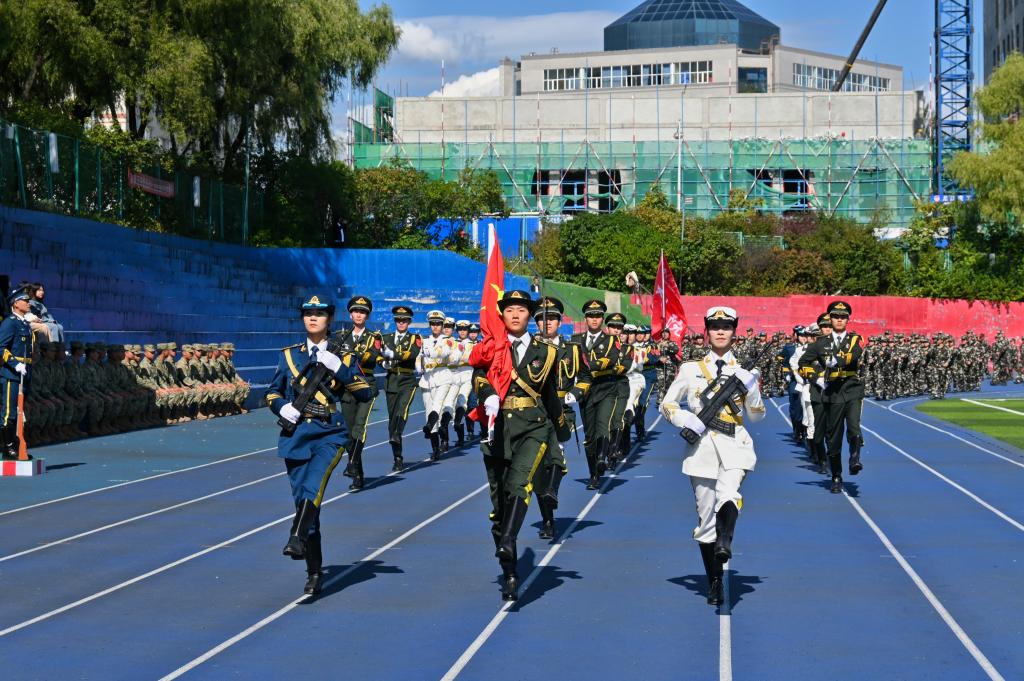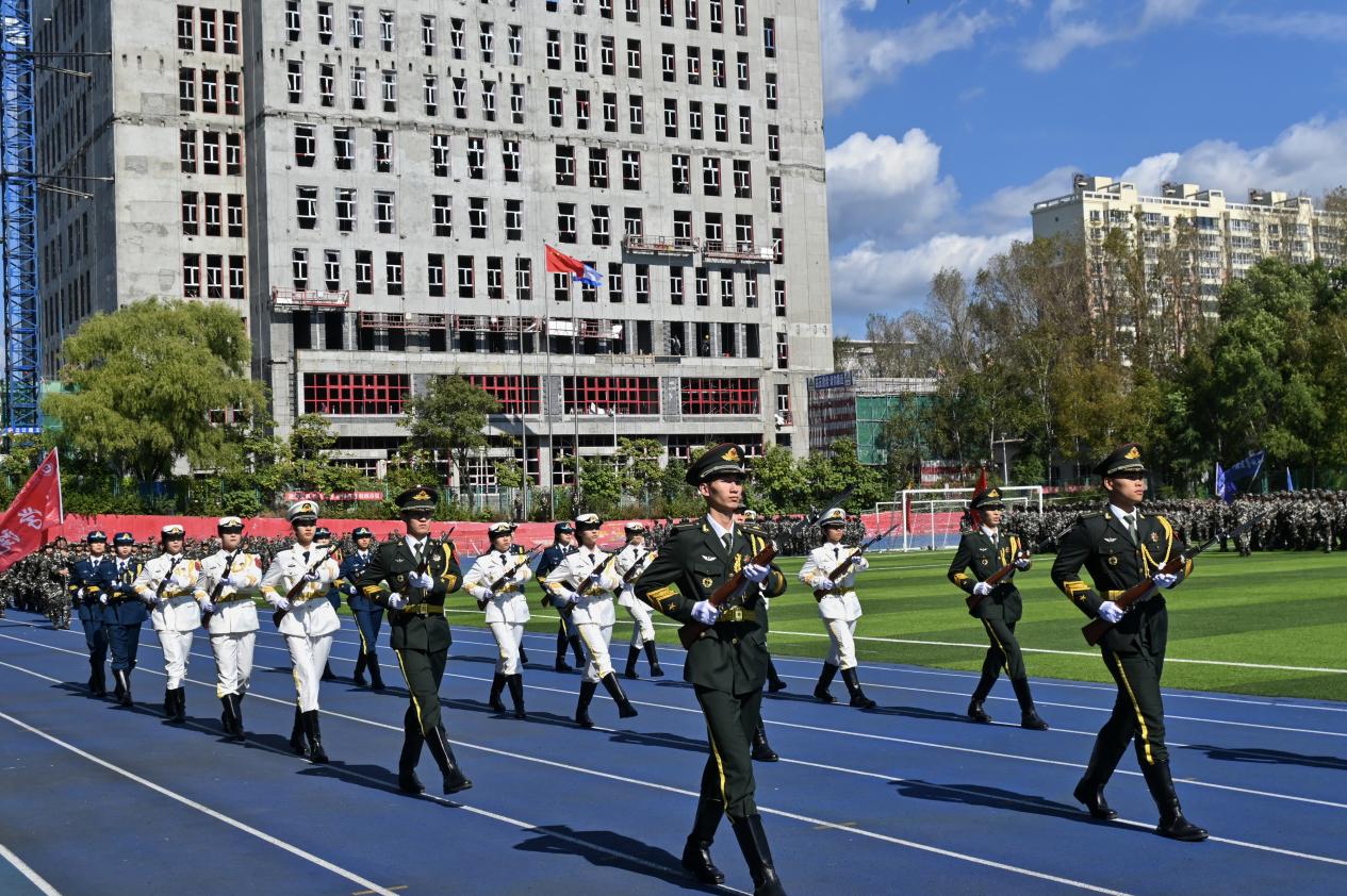 在庄严的国歌和激昂的校歌声中,国旗、校旗先后在田径场上冉冉升起,全体师生面向国旗行注目礼。随后,各二级学院方阵迈着整齐的步伐陆续经过主席台接受检阅,威武的军姿、矫健的步伐、嘹亮的口号充分展示了牡师院青年学子朝气蓬勃、团结向上、奋发进取的精神风貌,精彩的分列式表演完美呈现了军训的丰硕成果,赢得了在场师生阵阵掌声。体育与健康科学学院21连带来了军体拳汇报表演,一招一式,强劲有力,气势非凡、场面震撼。