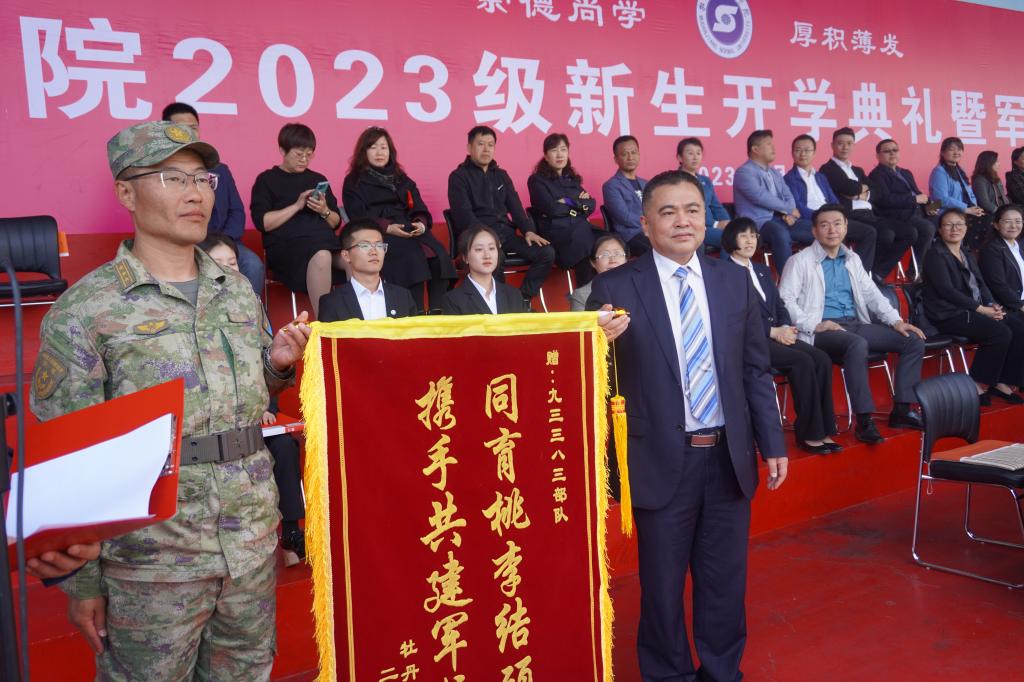 会上,军训师副师长、学校副院长张冰宣布2023级学生军训嘉奖令。校领导分别为获奖集体和个人颁奖并佩戴校徽,为优秀教官代表颁发证书。党委副书记刘松为承训部队赠送锦旗。新生代表梁佳琦、苑瑞书,在校生代表宫红江,教师代表于海英分别发言。