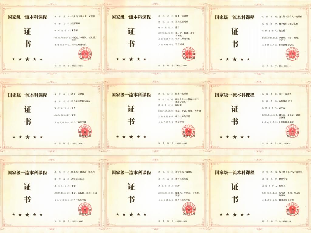 构建一流课程建设体系,获第二批国家一流课程9门,全国名列第181,省内前列;建设省级一流课程31门,第二批省级一流课程23门课程,省内名列第4;第三批省级一流课程18门,省内前列,哈外第二;省级研究生精品课程3门。自主开发线上课程资源,建有MOOC资源46门、SPOC资源41门。打造具有牡师特色的东北抗联课程群,红色文化类MOOC“东北抗联精神”选课学校113所,选课人数4.44万人,累计互动37.42万次。
