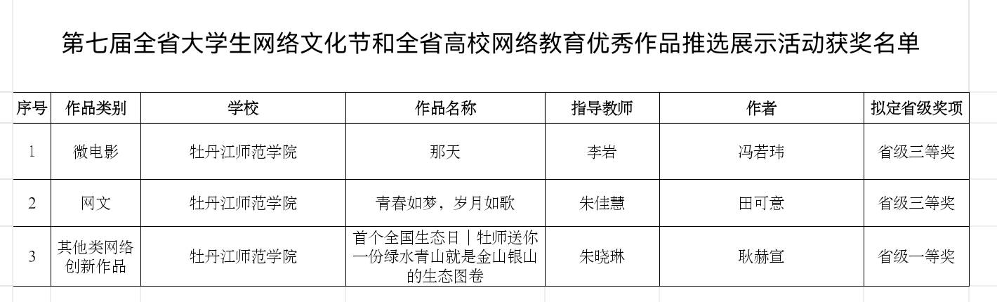 近日从党委宣传部获悉,第七届全省大学生网络文化节和全省高校网络教育优秀作品推选展示活动获奖名单揭晓。我校推选的作品喜获佳绩,其中文学院学生耿赫宣的作品《首个全国生态日|牡师送你一份绿水青山就是金山银山的生态图卷》荣获省级一等奖;数学科学学院学生冯若玮的作品《那天》、教育科学学院学生田可意的作品《青春如梦,岁月如歌 》荣获省级三等奖。获奖作品均被推荐参加国家比赛。