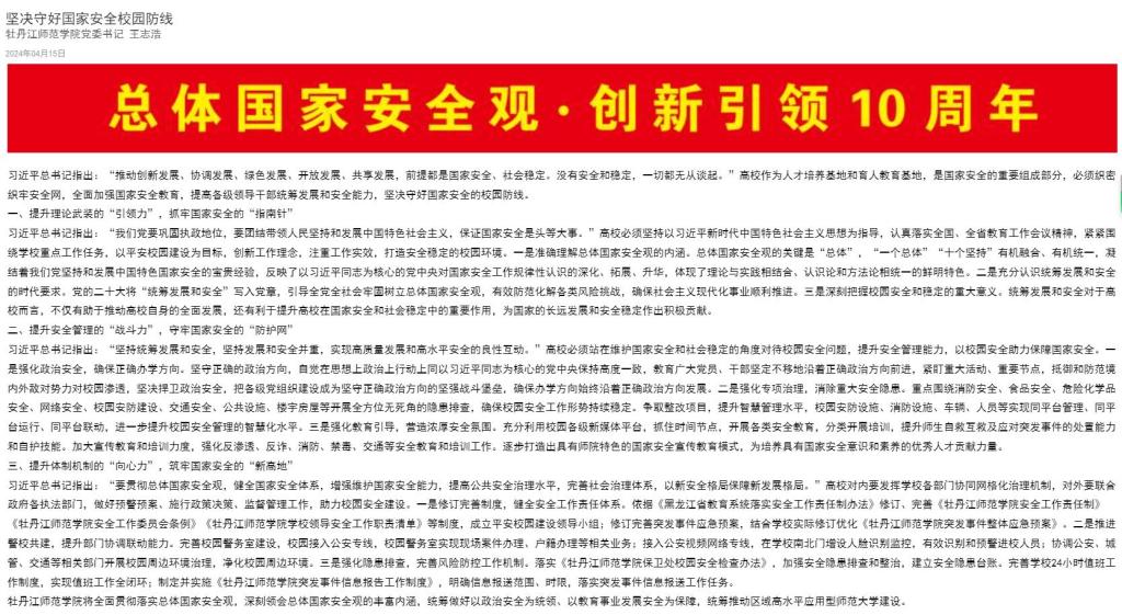 4月15日,黑龙江日报发表我校党委书记王志浩的署名文章《坚决守好国家安全校园防线》。