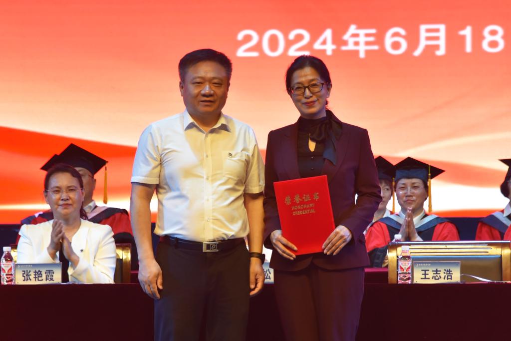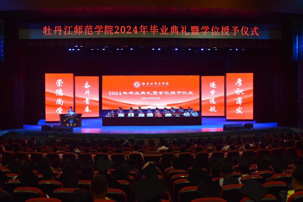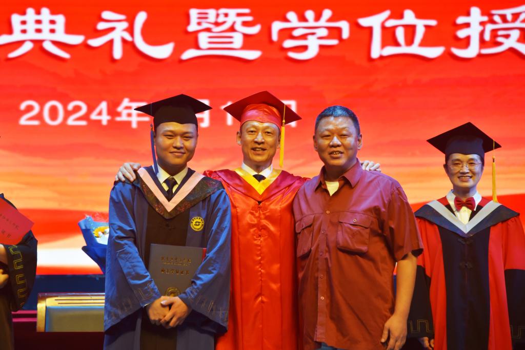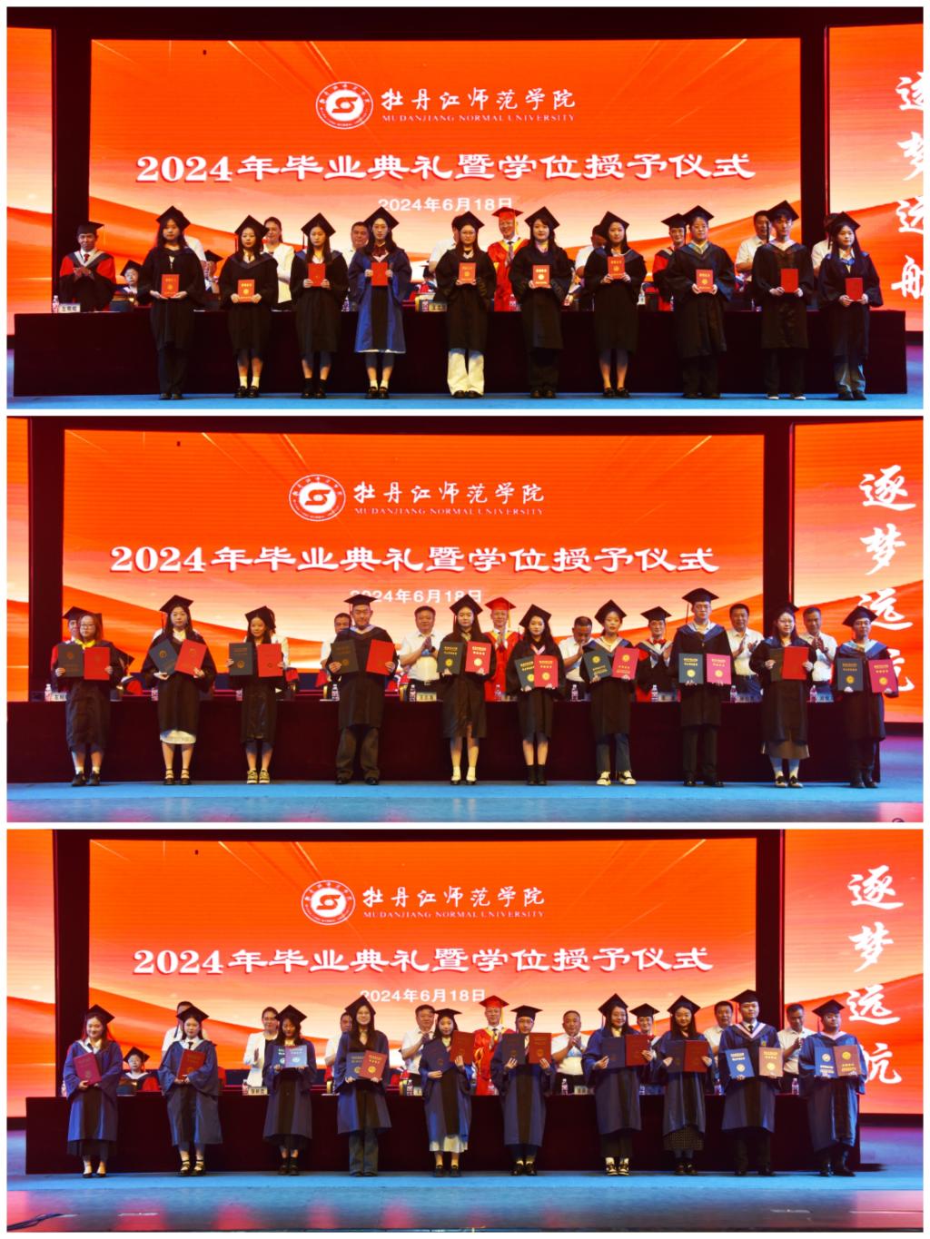 伴随着激昂的乐曲,党委书记王志浩为优秀校友代表,全国教书育人楷模、2024年全国“教育家精神”宣讲团成员,牡丹江市职业教育中心学校正高级教师,我校政法系1990届毕业生王丹凤颁发优秀校友证书。与会校领导为2024届毕业生代表颁发毕业证书、学位证书,为2024届毕业生先优代表颁发荣誉证书。