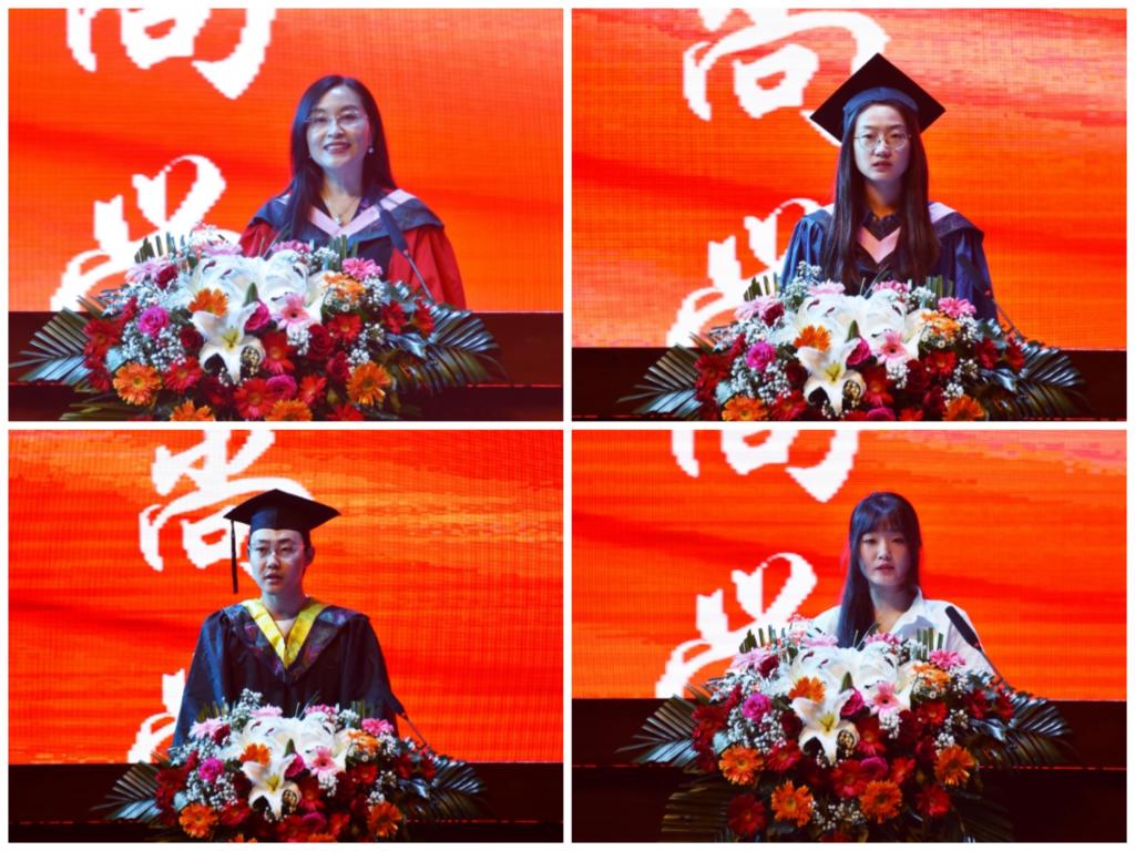 黑龙江省课程思政示范教学团队负责人,优秀硕士生导师、省五一劳动奖章获得者,博士、马克思主义学院马克思主义中国化学科带头人董一冰教授代表全体教师发言。考取黑龙江省大兴安岭新林区选调生的计算机与信息技术学院2020级计算机科学与技术专业张佳宝同学代表2024届全体本科毕业生发言。考取国防科技大学日语语言文学博士研究生的东方语言学院2021级外国语言学及应用语言学专业王冰同学代表2024届全体研究生毕业生发言。校学生会主席团成员、经济与管理学院2021级工商管理专业杜雪莹代表全体在校生发言。