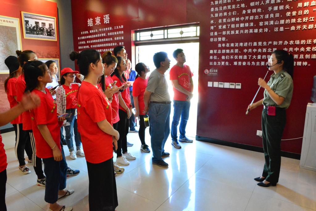 在南泥湾,师生们参观了当年“三五九旅”军垦区的南泥湾大生产展览馆,聆听了三五九旅”的感人事迹。垦荒南泥湾,是一个悲壮又令人产生革命浪漫情怀从而振奋的故事,南泥湾大生产是一部民族复兴的英雄史诗,是一曲开天辟地地悲壮赞歌。在这里师生们共同追溯老一辈革命家的足迹,缅怀无数共产党人艰苦卓绝、不怕流血牺牲的奋斗历史。在展览馆内,师生们自发的唱起了红遍大江南北的陕北民歌《南泥湾》,伴着歌声也让所有师生切身体会到了“独立自主自力更生”南泥湾精神内涵。