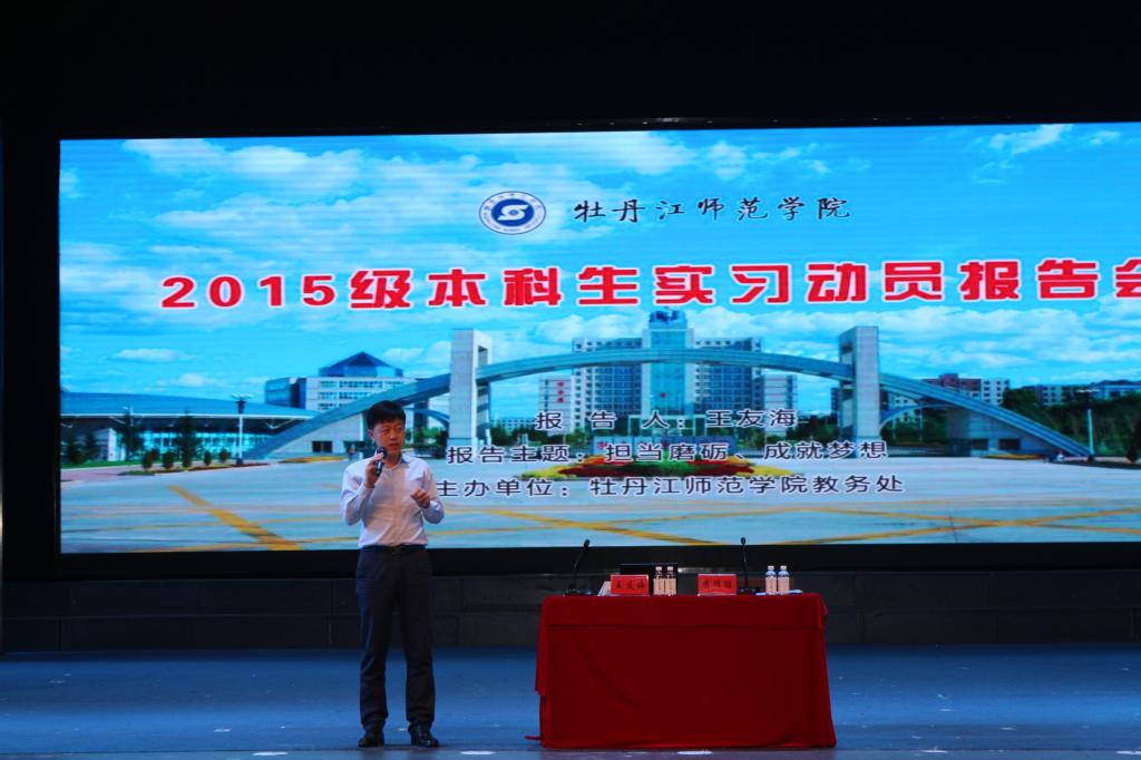 9月1日下午六点,在我校庆祝建校60周年之际,学校邀请了大连金玛控股集团副总裁王友海先生在学校第一音乐厅开展了题为“担当磨砺、成就梦想”的实习动员报告会,全校1300余名2015级学生代表参加了报告会。报告会由教务处处长周传胜主持。