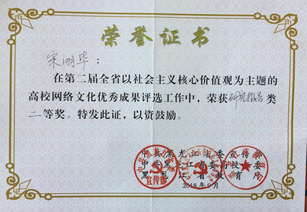 日前,第二届全省以社会主义核心价值观为主题的高校网络文化优秀成果评选工作圆满结束。全省27所高校师生报送研究报告、微课、网文、网络公益广告、微电影五类100项成果参评,我校马克思主义学院副教授张云霞的网络文章《坚守党的初心与使命——东北抗联精神与红船精神》获得网文类一等奖;文学院教授宋明华的研究报告《新媒体时代黑龙江流域少数民族手工艺传播策略研究》获得研究报告类二等奖。