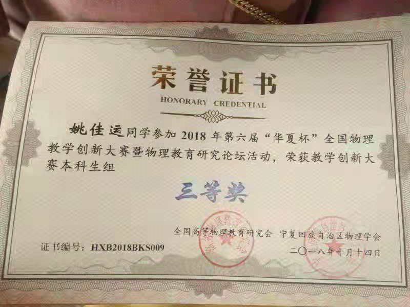 10月13日,由高等物理教育研究会主办,宁夏大学承办的第六届“华夏杯”全国物理教学创新大赛在银川宁夏大学举行,来自全国28个省、市、自治区的57所高校、51所中学共476位代表及选手参赛。我校物理与电子工程学院学生孙月、姚佳运、杨鑫等三人,在教师吴同华、陈薇薇、胡巍的指导下,分获本科组全国二等奖、三等奖。