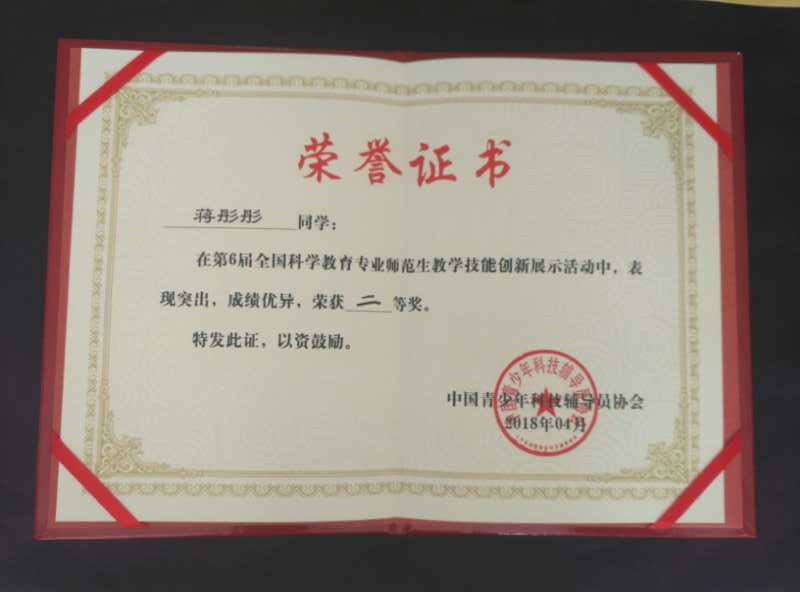 今日获悉,2018年3月30日至4月1日,由中国青少年科技辅导员协会、闽南师范大学主办,闽南师范大学化学与环境学院承办的全国第六届“科学教育专业师范生”教学技能创新展示活动顺利落下帷幕。经过激烈的比拼,由教育科学学院远新蕾老师指导的2015级科学教育专业的学生蒋彤彤的参赛作品《物体在水中是沉还是浮》荣获小学组二等奖。