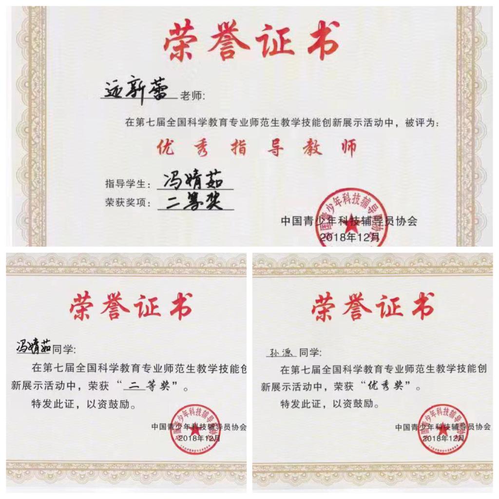 12月10,由中国青少年科技辅导员协会主办的“第七届全国科学教育专业师范生教学技能创新展示活动”在湖北武汉城市职业学院圆满落下帷幕。教育科学学院科学教育专业学生冯婧茹、孙源在远新蕾老师的指导下分获二等奖、优秀奖,远新蕾荣获优秀指导教师。