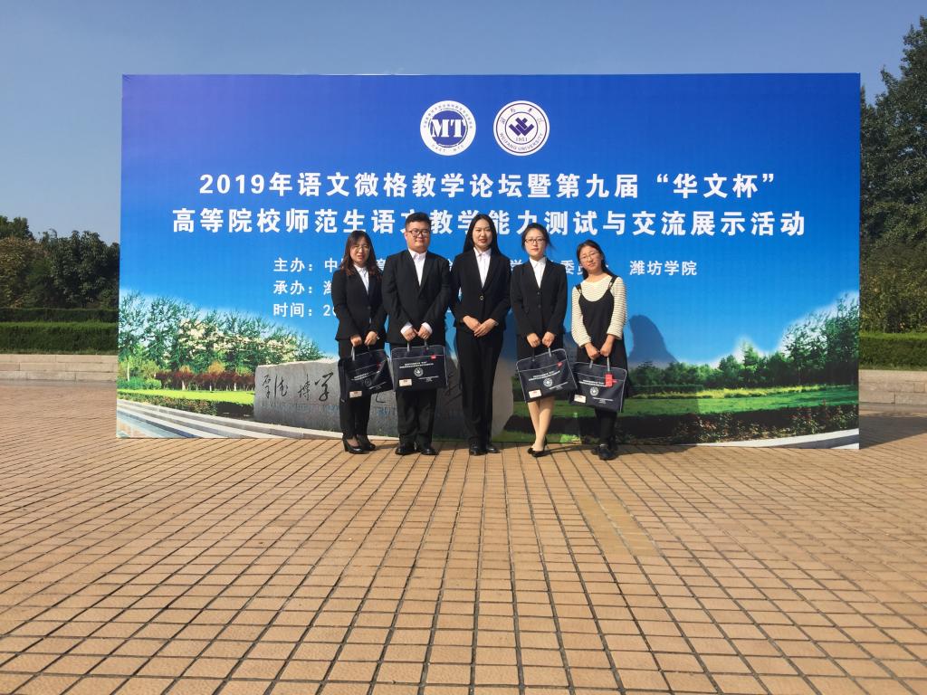 10月11日至14日,2019年语文微格教学论坛暨第九届“华文杯”全国高等院校师范生语文教学能力测试与交流展示活动在山东省潍坊市潍坊学院举行。我校文学院2名教育硕士和3名汉语言文学专业本科生参加比赛并喜获佳绩。