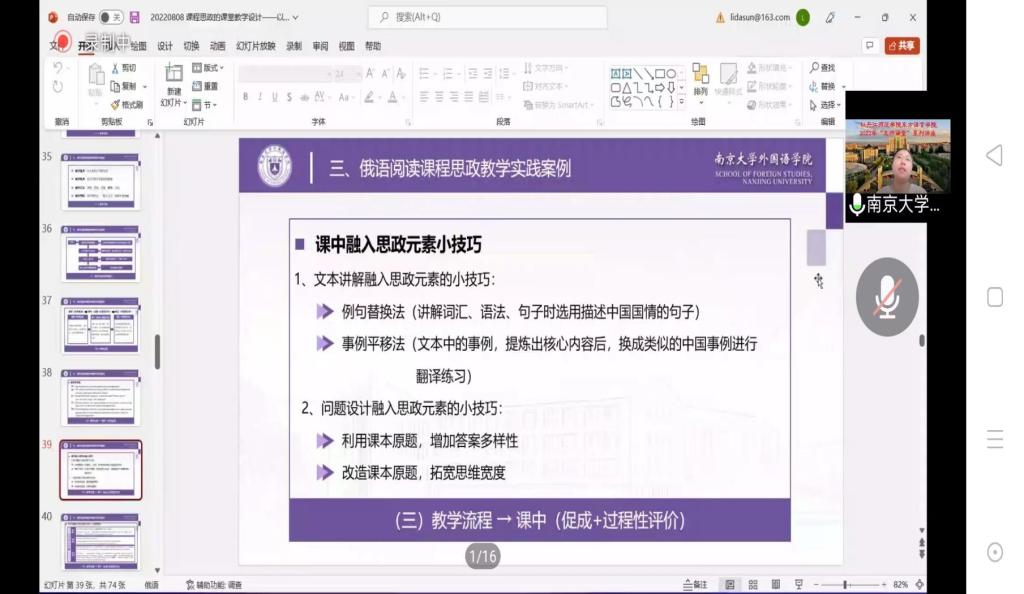 孙飞燕博士结合《俄语阅读3》课程思政建设经验和教学实践案例,从多维视角阐述了如何结合阅读课的教学内容生动融入思政内容。她重点介绍了俄语阅读课程的思政教学目标要求、内容重点、方法路径与评价反思,以具体章节为例分析了课程思政设计、实践案例中融入思政元素的技巧,展示了她本人的获奖微课案例和微课示范,为广大外语教师提供了宝贵经验和参考思路。