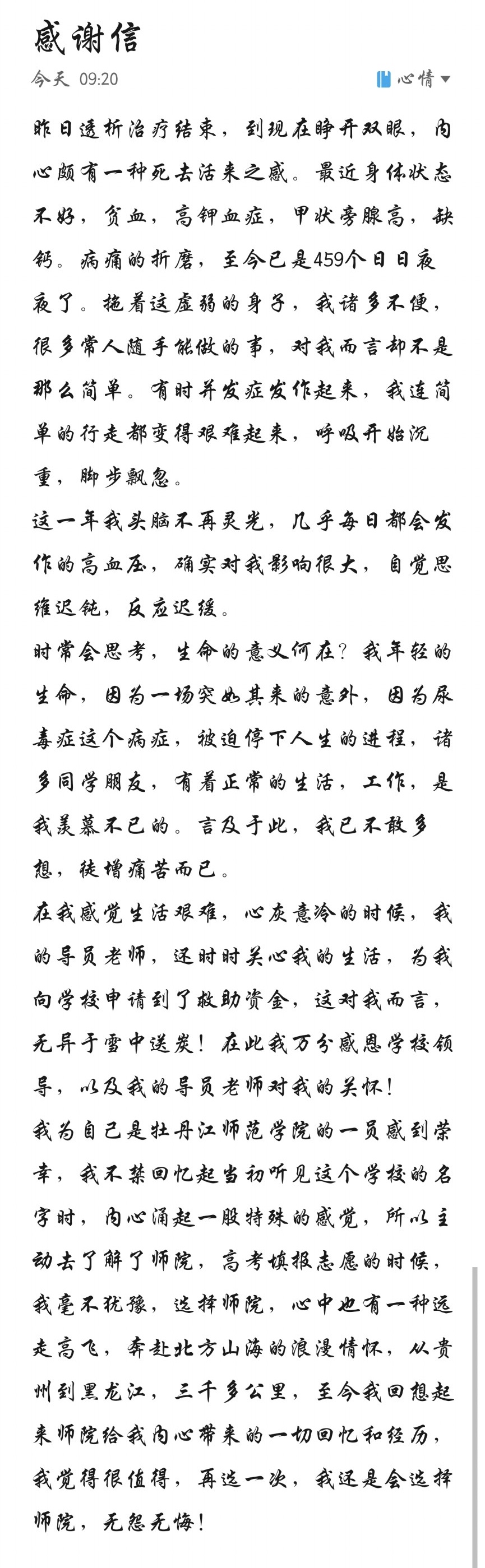 “我是一名孤儿,已经很苦了,又得了这种绝症,已经没有再活下去的勇气和希望了,以前是政府和社会好心人士资助上学,现在是母校两次挽救我的生命,给予了生的希望”。