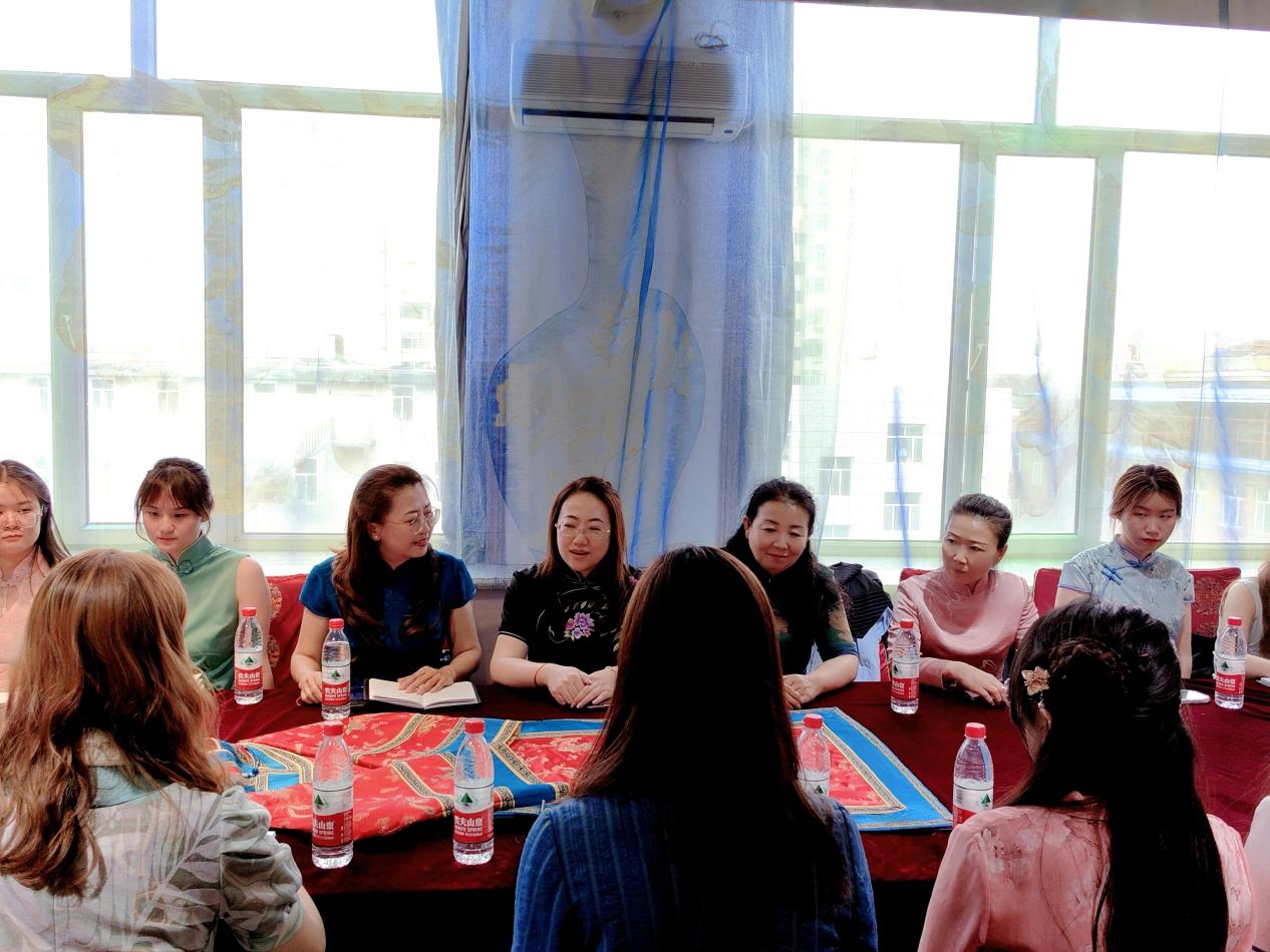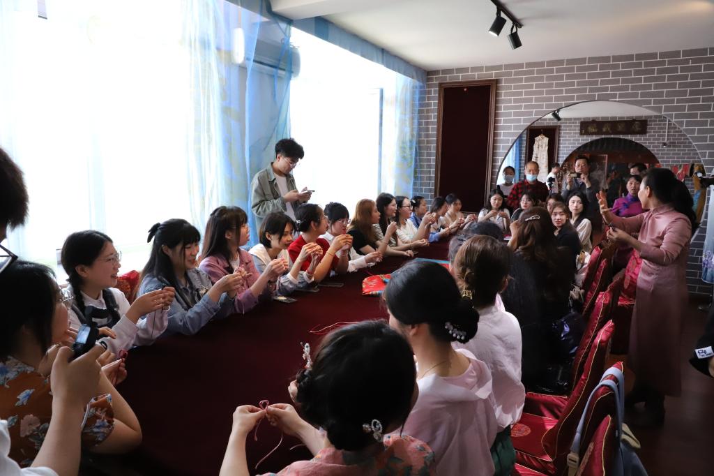 师生们跟随贾老师学习了满族旗袍“盘扣和蝴蝶扣胸针”的制作技艺,穿上了精致华美、技艺精湛的各式旗袍。在学习与体验中对这项传统技艺产生了浓厚的兴趣,充分领略了传统技艺的精细性与文化内涵的丰富性,感受到了文化传承的艰巨性和使命感。
