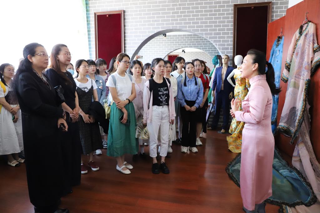 满族旗袍制作技艺传承人贾淑娟带领师生参观了满族旗袍制作展馆,介绍了满族旗袍的发展历史与制作工艺,满族旗袍近年来在制作技艺、审美风格以及展现地方文化元素等方面的创新发展,和文创产品研发情况,使师生们深刻感受到了满族旗袍所焕发的生机活力。