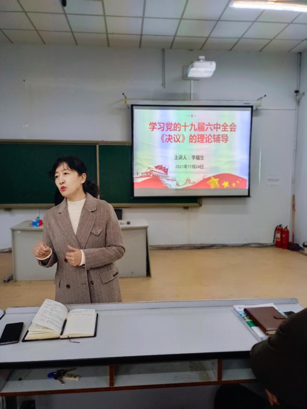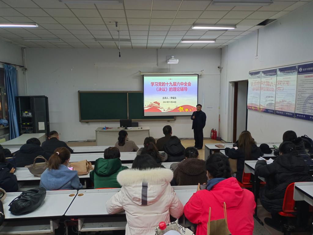 11月24日下午,经济与管理学院院长李福生在文科楼436教室作党的十九届六中全会《决议》专题理论辅导。经济与管理学院党政领导班子及全体教职工参加学习。